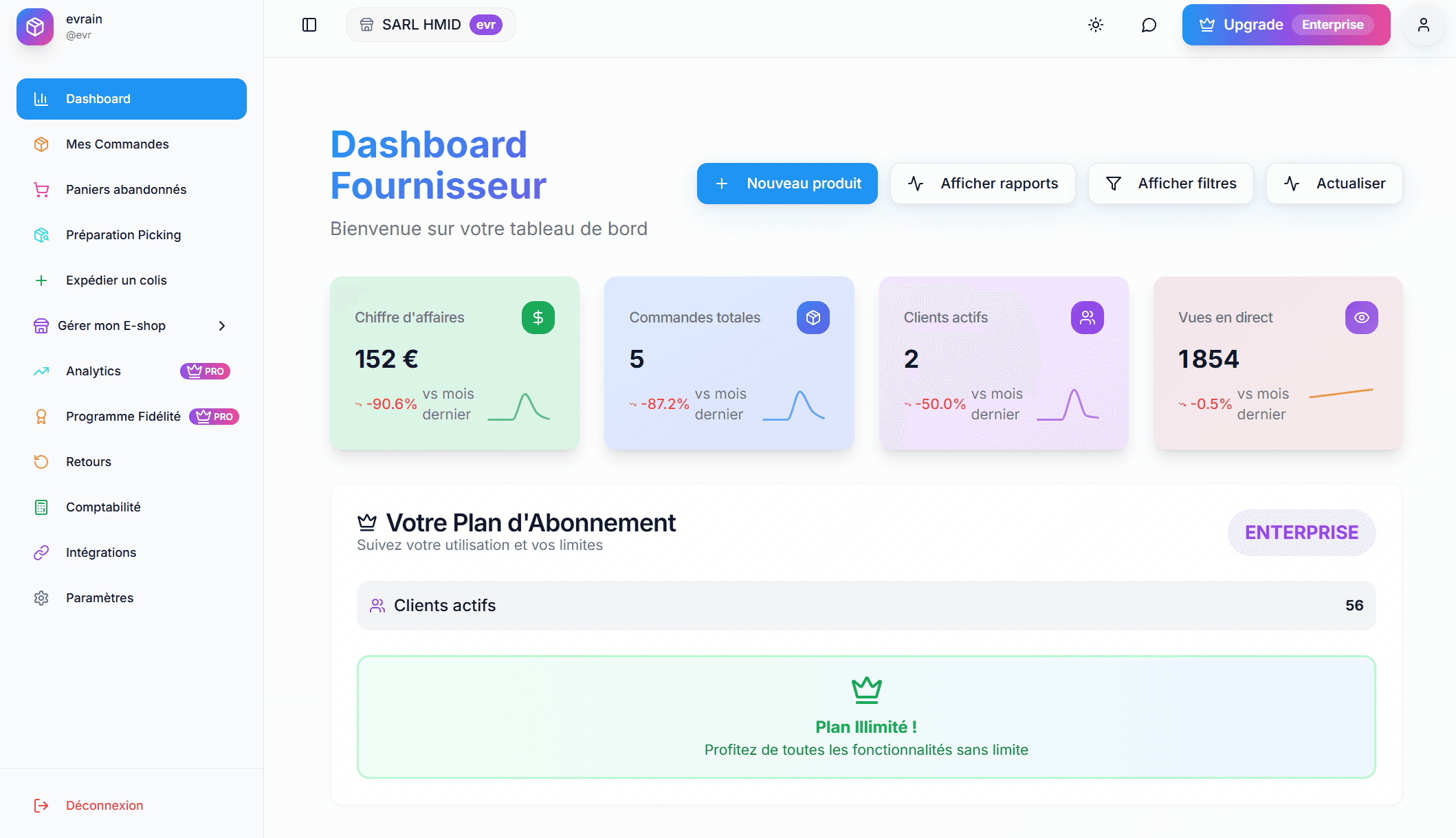 Votre dashboard centralise CA, commandes totales , clients actifs et vues en direct sur une seule interface intuitive. Plus besoin de jongler entre applications